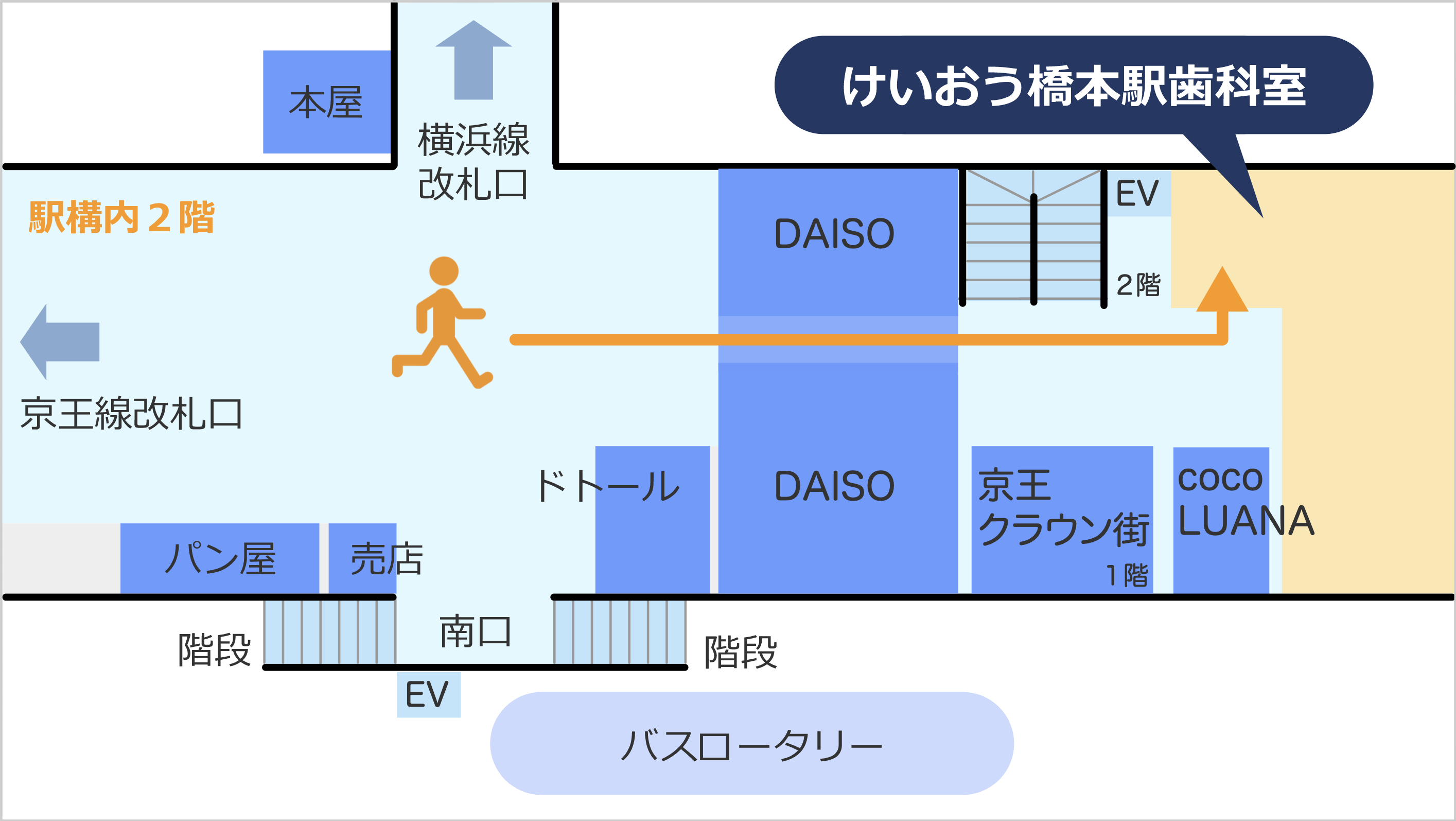 京王線、JR横浜線・相模原線の橋本駅方面から「DAISO」を通り抜けた先に当院がございます。ご来院の際は、地上に下りずに当院までお越しいただけます。